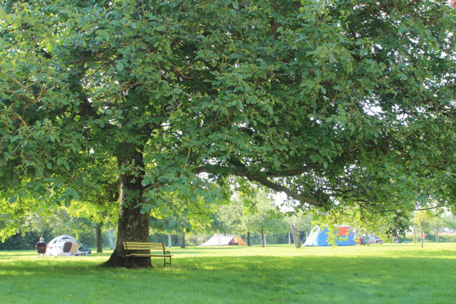 In de ruime appelboomgaard kampeer je zonder afgebakende plaatsen, midden in het groen. Kies een plekje in de zon óf juist in de schaduw van één van de appelbomen. Er is geen stroom bij de tenten, wat bijdraagt aan het rustige karakter. In de bar/ontmoetingsruimte vind je een koelkast, combimagnetron en oplaadpunten voor algemeen gebruik. Voor kleine busjes, campers en caravans tot 6 meter zijn er enkele plekken met elektriciteit.