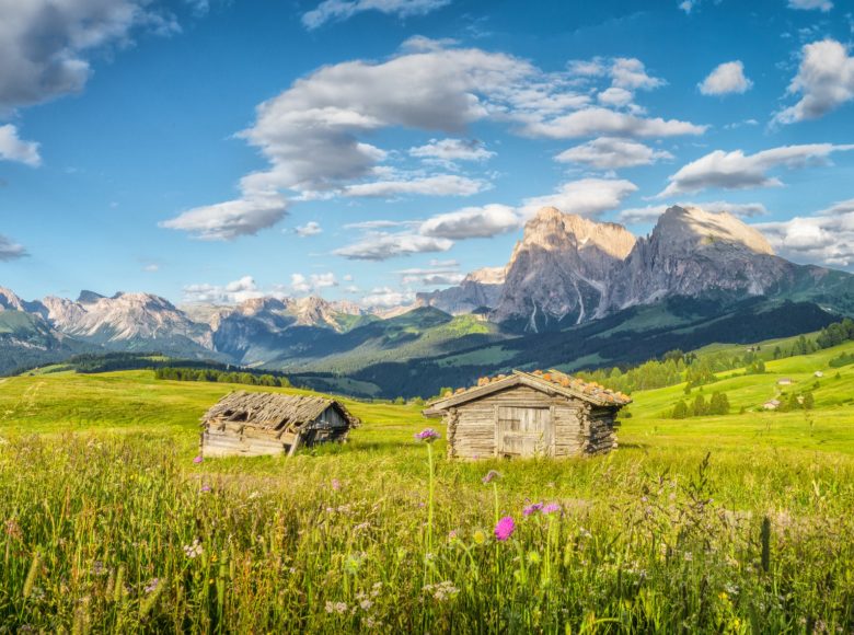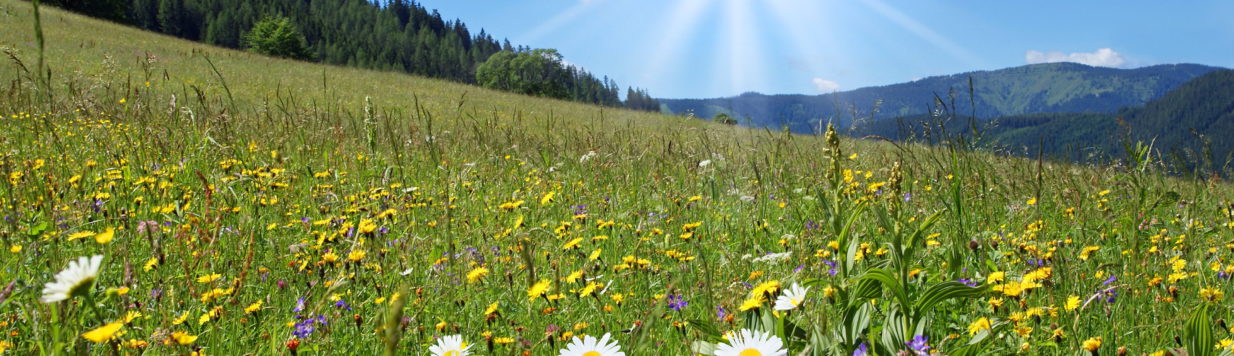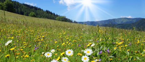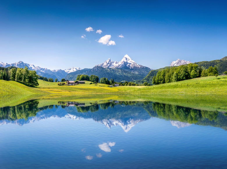 Imposante bergen, heldere bergmeren en weiden van bloemen.