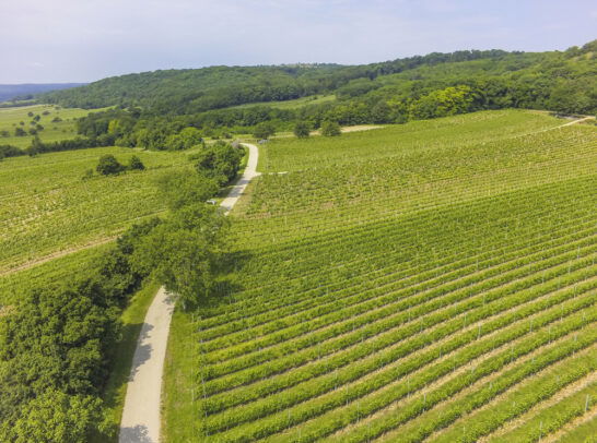 Vlakke, uitgestrekte landschappen en groene heuvels met wijngaarden.